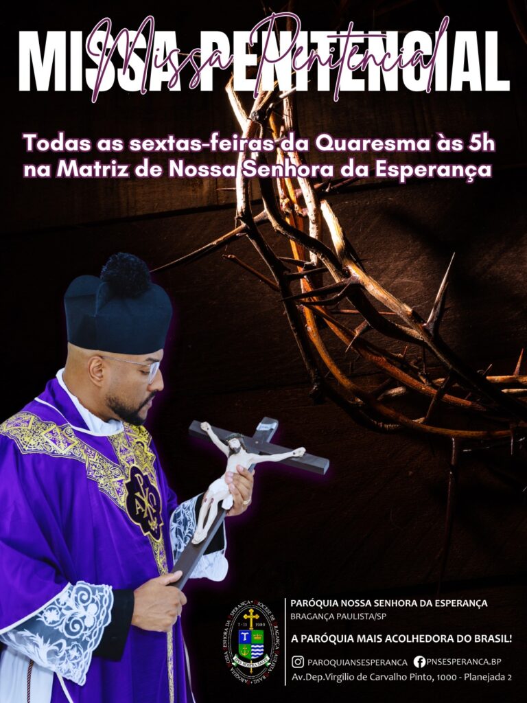 Durante este santo tempo, nossa comunidade é convidada a viver as Missas Penitenciais, que acontecerão todas as sextas-feiras da Quaresma, às 5h da manhã, na Matriz de Nossa Senhora da Esperança, celebradas pelo nosso pároco, Padre Diogo Albuquerque.