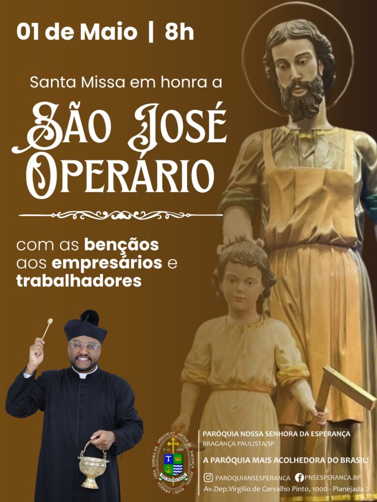 Na próxima sexta-feira, 01 de maio, às 8h, teremos a Santa Missa em honra a São José Operário, na matriz de Nossa Senhora da Esperança.